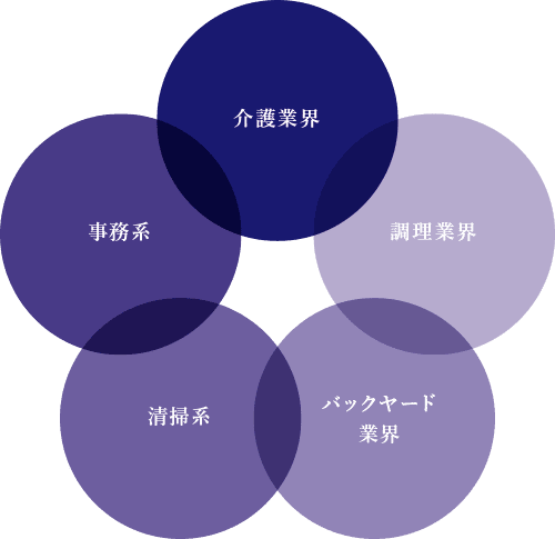 介護補助や清掃業、調理業界、バックヤード(工場ライン系)を