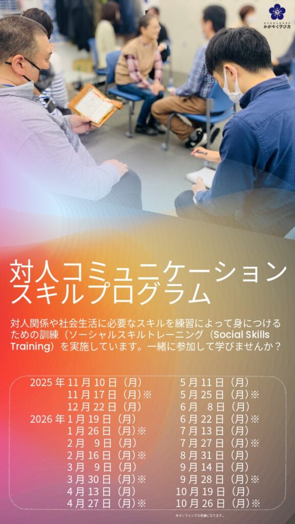 2025-12-29 対人コミュニケーションスキルプログラム 職場で必要となる対人関係や社会生活に必要なスキルを“練習して身につける”ためのトレーニング『ソーシャルスキルトレーニング(Social Skills Training)』を実施しております。 普段の訓練でも取り入れていますが、企業担当者・支援機関の相談員・地域のボランティアスタッフにご協力いただき実践的な取り組みを開催しています。一緒に学びましょう。 ※印はオンラインでの参加が可能です。詳細についてはお気軽にお問合せください。 < 前の記事へ 一覧へ戻る 次の記事へ >